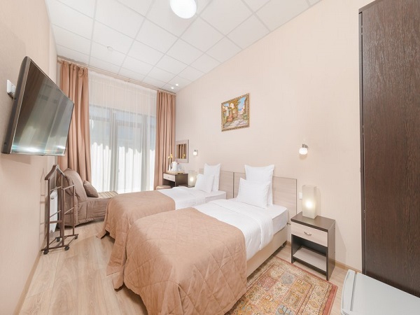 В каждом номере - светлый приятный интерьер, есть ванная комната с душем, а также необходимая техника - ТВ, холодильник, фен, чайник. сплит-система.